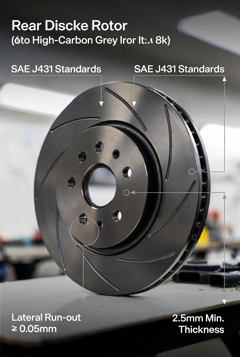Rear disc rotors are engineered from High-Carbon Grey Cast Iron to ensure high thermal conductivity and comply with SAE J431 or ISO safety standards. They maintain strict dimensional tolerances, such as a lateral run-out under 0.05mm, to provide smooth braking and prevent pedal pulsation.