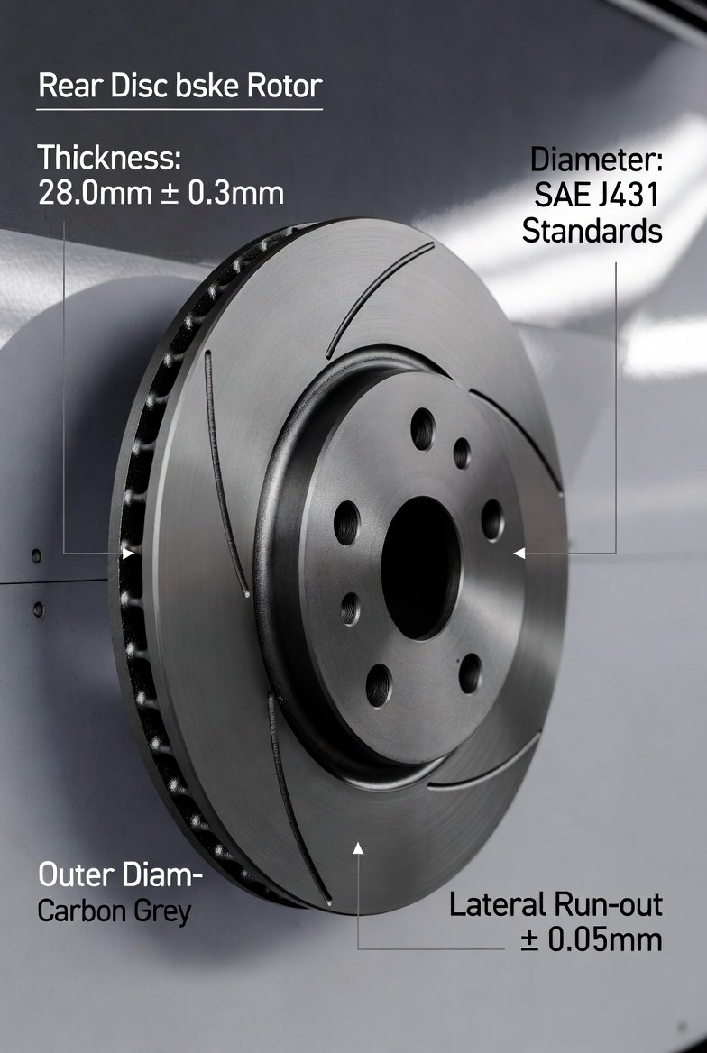 Rear disc rotors are primarily engineered from High-Carbon Grey Cast Iron (specifically Grade G3000 or G3500) due to its superior thermal conductivity, vibration damping, and wear resistance. These components are manufactured according to strict international standards such as SAE J431 and ISO 26867, which dictate the chemical composition and mechanical strength required for safe braking. Dimensionally, rear rotors are often designed as “solid” discs—unlike the thicker, vented front rotors—since they handle less braking load. To ensure smooth operation, critical tolerances such as Lateral Run-out (typically kept under 0.05mm) and Disc Thickness Variation (DTV) (under 0.01mm) are strictly enforced to prevent pedal pulsation and ensure consistent friction across the surface.